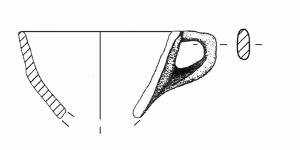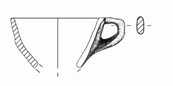 Orlo arrotondato. In corrispondenza dell'orlo, ansa nastriforme ad orecchia con ponticello orizzontale. Colore: nero.