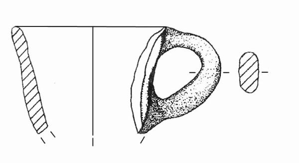 Orlo piatto, labbro leggermente esoverso; parete a profilo convesso. All'altezza dell'orlo, ansa nastriforme con profilo ad orecchio. Colore: bruno.