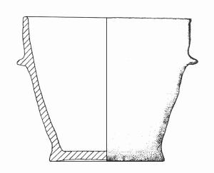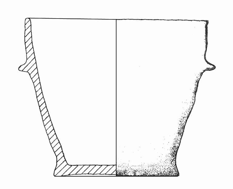 Orlo arrotondato; parete a profilo convesso; tacco; base concava. A breve distanza dall'orlo due prese a linguetta rettangolare (dovevano essre 4) diametralmente opposte. Colore: bruno scuro.