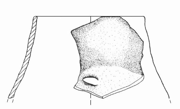 Orlo piatto, parete superiore concava. Poco sopra il diametro max si conerva l'attacco superiore dell'ansa. Colore: bruno.