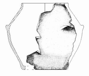 Orlo arrotondato, labbro esoverso; profilo sinuoso. In corrispondenza del diametro max presa a linguetta sub-triangolare. Colore: bruno.