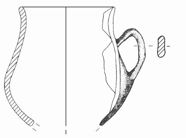 Orlo arrotondato, labbro leggermente esoverso. Ansa nastriforme a gomito con ponticello superiore obliquo. Colore: bruno.