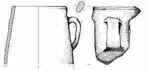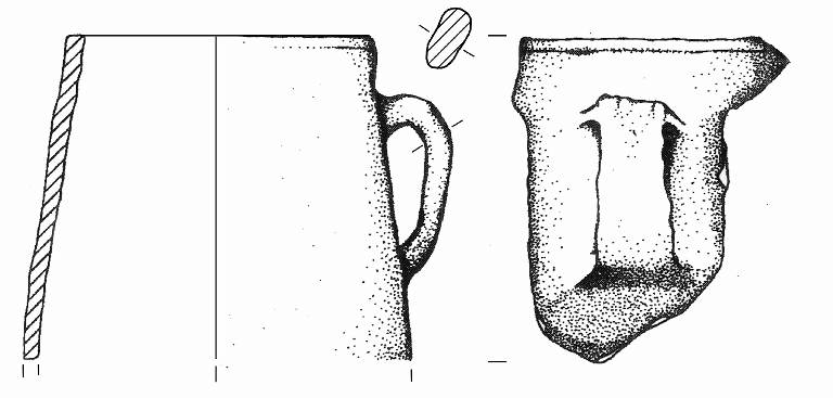 Orlo piatto; parete rettilinea. Ansa nastriforme ad orecchia. Colore: bruno.