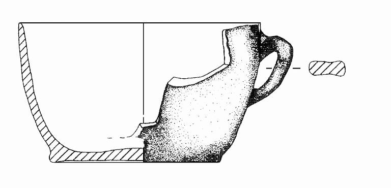 Orlo arrotondato; parete convessa, fondo leggermente concavo. Ansa nastriforme con profilo ad orecchia impostata poco sotto l'orlo. Colore: bruno.