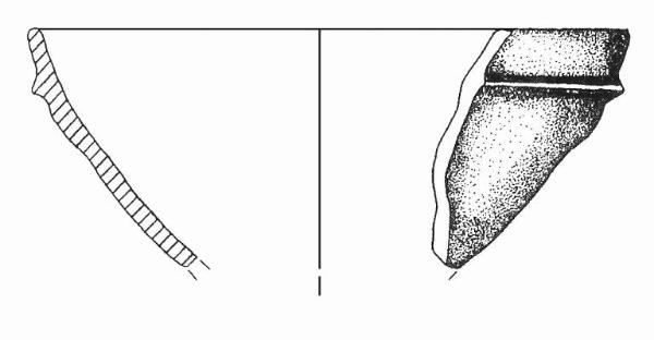 Orlo arrotondato; corpo troncoconico. A breve distanza dall'orlo, cordone plastico con andamento orizzontale. Colore: grigio-bruno.