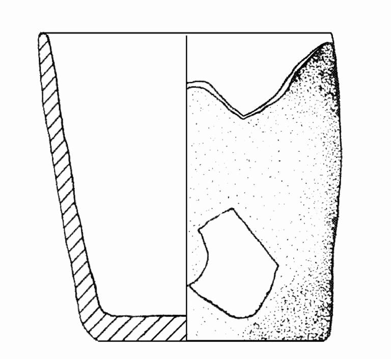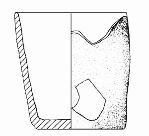 Orlo arrotondato, assottigliato; parete a profilo sub-rettilineo; base piana. Colore: bruno-grigio.