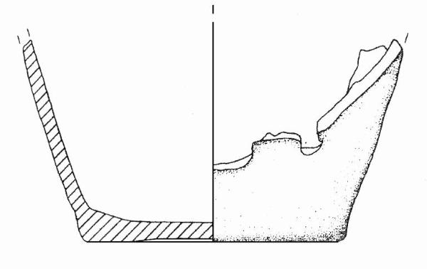 Base leggermente concava; parete rettilienea. Colore: bruno chiaro.\nResti combusti sulla parete interna.