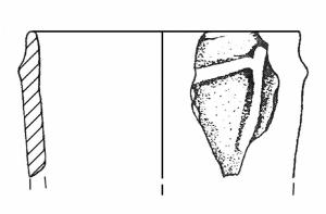 Orlo arrotondato, assottigliato; parete a profilo rettilineo. A breve distanza dall'orlo è impostato un motivo decorativo costituito da un cordone orizzontale da cui se ne diparte un secondo con andamento obliquo. Colore: bruno.