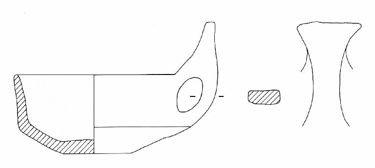 Orlo di forma arrotondata; parete distinta rettilinea, lievemente svasata all'orlo; vasca troncoconica; fondo piano. Ansa sopraelavata con appendice asciforme.\nColore: grigio scuro.