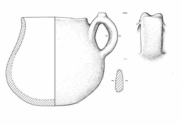 Orlo arrotondato, leggermente esoverso, base piano-convessa. Ansa nastriforme ad orecchio, leggermente sopraelevata rispetto all'orlo, con due brevi appendici tronco-coniche all'apice.\nColore: grigio.