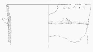 Orlo di forma arrotondato, multiforato; lati con andamento irregolare. Cordone plastico orizzontale con presa a linguetta.\nColore: marrone.