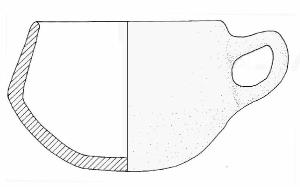Orlo di forma arrtondata; parete superiore rettilinea, rastremata verso l'orlo; vasca a calotta; fondo piano. Ansa nastriforme ad orecchio impostata sotto l'orlo e in corrispondenza del diametro max.\nColore: grigio scuro.