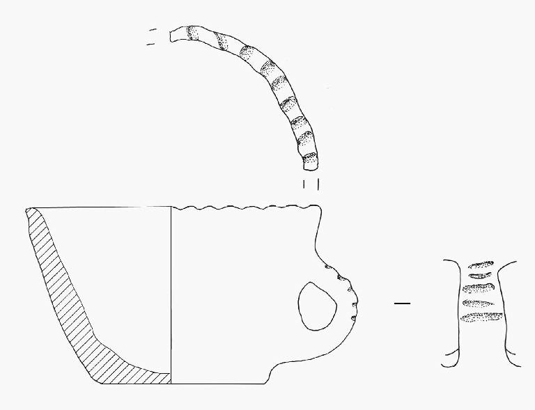 Orlo di forma arrotondata, decorato a impressioni digitali; lati leggermente convessi; fondo piano. Ansa di piccole dimensioni ad anello decorata a solcature disposte nel senso della largheza.\nColore: da beige a grigio scuro.