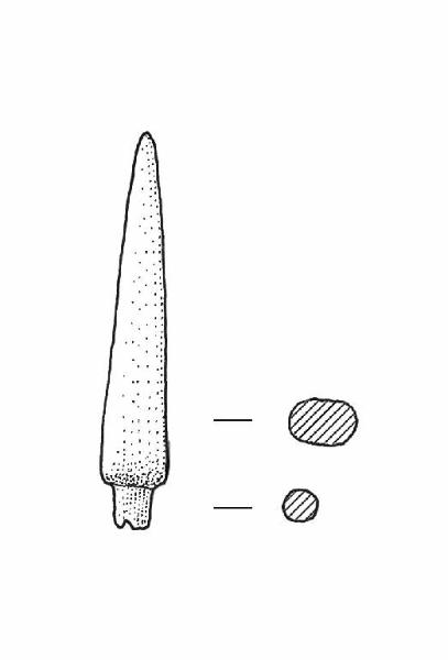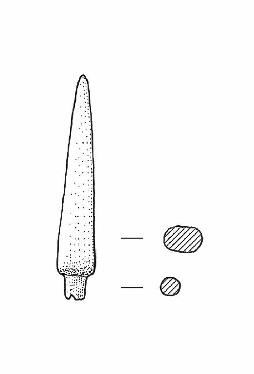 Punta tronco-piramidale a sezione sub-quadrangolare. Spigolo vivo tra punta e peduncolo. Peduncolo a sezione circolare.