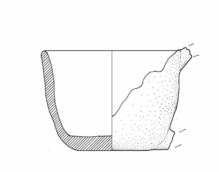 Orlo di forma arrotondata; fondo piano. L'ansa era impostata in corrispondenza dell'orlo e del fondo.\nColore: marrone rossiccio.