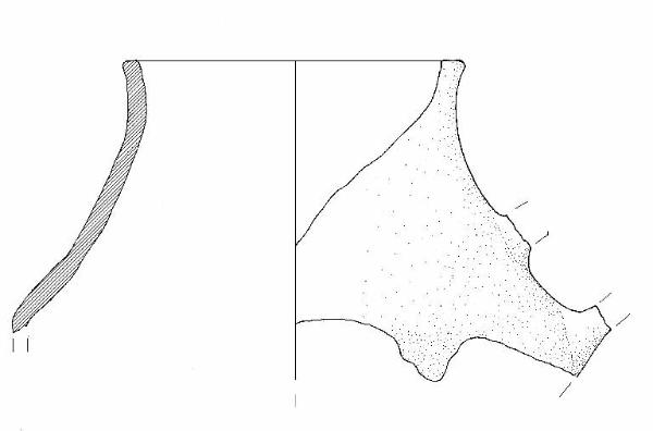 Orlo piatto, parete superiore con andamento sub-rettilineo. Ansa impostata in corrispondenza del diametro max.\nColore: marrone.