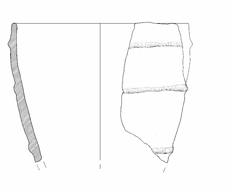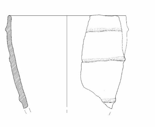 Orlo di forma arrtondata; parete con andamente leggermente convesso. 3 cordoncini plastici orizzontali con andamento irregolare.\nColore: marrone.