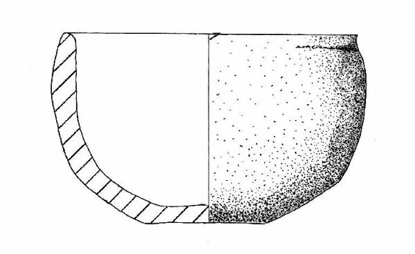 Tazza emisferica con orlo arrotondato, parete a profilo continuo, fondo piano.\nImpasto a tessitura fine, di colore grigio, inclusi puntiformi, con frequenza scarsa e distribuzione irregolare.