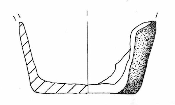Fondo appiattito, parete a profilo rettilineo.\nImpasto con inclusi litici di medie dimensioni, di colore bruno chiaro.