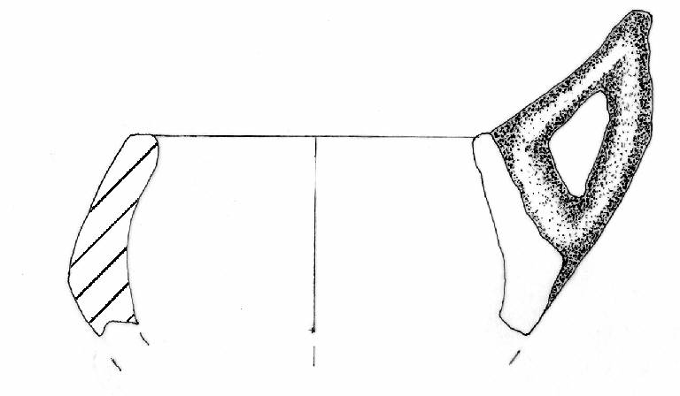Capeduncola con orlo arrotondato, parete a profilo continuo, con Ø orlo > Ø max. All'altezza dell'orlo è imposta un'ansa a nastro sopraelevata con breve appendice asciforme. \nImpasto con inclusi litici di medie dimensioni, di colore grigio scura.