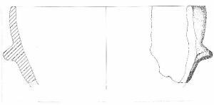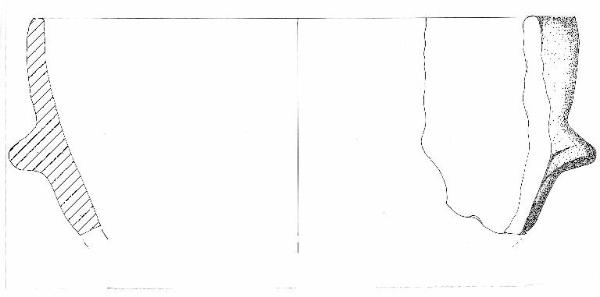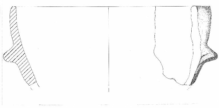 Vaso troncoconico con orlo appiattito, parete convessa. A breve distanza dall'orlo è impostata una presa a linguetta da cui si snoda un cordone plastico orizzontatale poco pronunciato.\nImpasto a tessitura grossolana con inclusi litici micacei anche di grandi dimensioni, di colore bruno chiaro sulla parete più scuro vicino all'orlo.