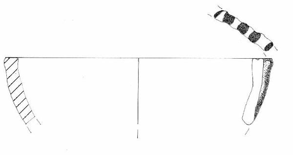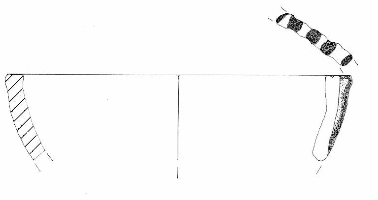 Scodella emisferica con orlo appiattito. Sull'orlo è presente un motivo decorativo costituito da impressioni a polpastrello.\nImpasto a tessitura grossolana con inclusi litici anche di medie dimensioni, di colore bruno.