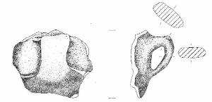 Frammento di tazza troncoconica. Si conserva frammento di parete su cui è impostata un' ansa nastriforme con profilo ad anello.\nImpasto a tessitura grossolana con inclusi litici di medie dimensioni, di colore bruno chiaro, più scuro sulla superficie interna.
