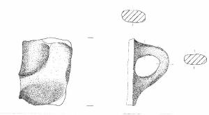Frammento di tazza/Vaso troncoconico. Si conserva frammento di parete su cui è impostata un' ansa nastriforme con profilo ad anello.\nImpasto a tessitura grossolana con inclusi litici di medie dimensioni, di colore bruno chiaro.