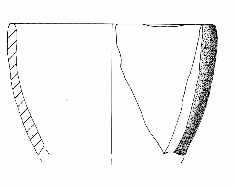 Frammento di tazza troncoconica. Si conserva frammento di parete e orlo.\nImpasto a tessitura fine, di colore grigio scuro, inclusi puntiformi, con frequenza scarsa e distribuzione irregolare.