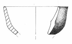 Frammento di tazza con orlo arrotondato e parete con profilo leggermente carenato. \nImpasto a tessitura fine, di colore grigio scuro a tratti rossiccio, inclusi puntiformi, con frequenza scarsa e distribuzione irregolare.