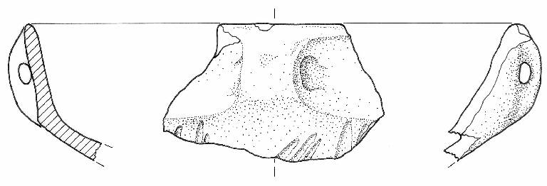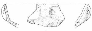 Scodella con orlo assottigliato, corpo carenato a parete leggermente concava, con Ø orlo > Ø carena, vasca troncoconica, ansa canaliculata. Sulla vasca sono presenti fasci di solcature parallele. Impasto a tessitura media, di colore grigio (7,5R5/0), inclusi puntiformi, granulosi e grossolani, con frequenza abbondante e distribuzione irregolare. Superficie lisciata, a tratti lucidata, di colore grigio (7,5R6/0).