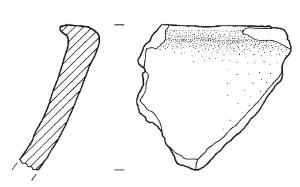 Frammento di orlo a piccola tesa.\nImpasto a tessitura fine, di colore grigio (2,5Y5/0), inclusi puntiformi e granulosi, con frequenza scarsa e distribuzione irregolare. Superficie lisciata, esterna di colore grigio (2,5Y5/0), interna di colore grigio scuro (2,5Y5/0).