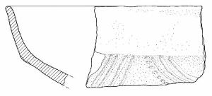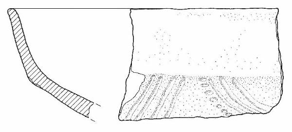 Scodellone con orlo arrotondato, corpo carenato a parete rettilinea, con Ø orlo > Ø carena, vasca troncoconica. Al di sotto della linea di carena vi sono un fascio di 4 solcature parallele ed un fascio di 3 solcature parallele, affiancate da una fila di coppelle. Numerose incrostazioni calcaree sulla superficie esterna ed interna, la ceramica è stracotta.\nImpasto a tessitura media, di colore grigio chiaro (7,5R7/0), inclusi puntiformi, granulosi e grossolani, con frequenza scarsa e distribuzione irregolare. Superficie esterna di colore grigio chiaro(7,5R7/0) e rosa grigio (2,5YR7/2), interna di colore grigio chiaro (7,5R7/0).