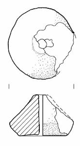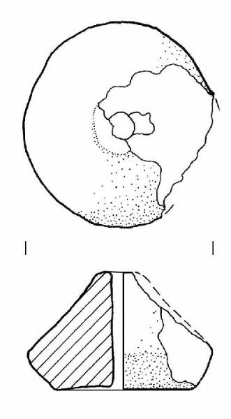 Fusarola biconica a base leggermente concava, con lati leggermente concavi; alcune incrostazioni calcaree, un'estesa sbrecciatura sulla sommità.\nImpasto a tessitura medio, di colore grigio rosa (7,5YR7/2), inclusi puntiformi e granulosi, con frequenza scarsa e distribuzione irregolare. Superficie con tracce di lisciatura, di colore grigio rosa (7,5YR7/2).