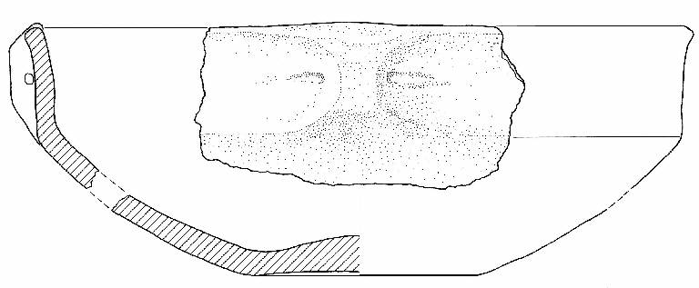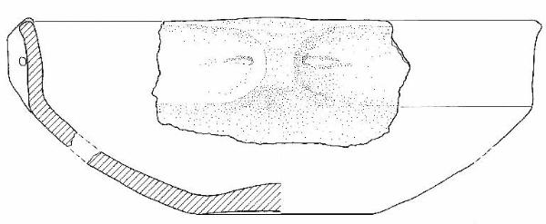 Scodellone con orlo arrotondato ed estroflesso, corpo carenato a parete leggermente concava, con Ø orlo > Ø carena, vasca a calotta, fondo leggermente concavo. Ansa a tunnel con margine superiore leggermente convesso, impostata su orlo e carena.\nImpasto a tessitura media, di colore grigio chiaro (2,5Y7/0), inclusi puntiformi e granulosi, con frequenza scarsa e distribuzione irregolare. Superficie lisciata e a tratti lucidata, esterna di colore grigio (7,5R5/0) e grigio rosa (5YR7/2), interna di colore grigio (7,5R5/0).