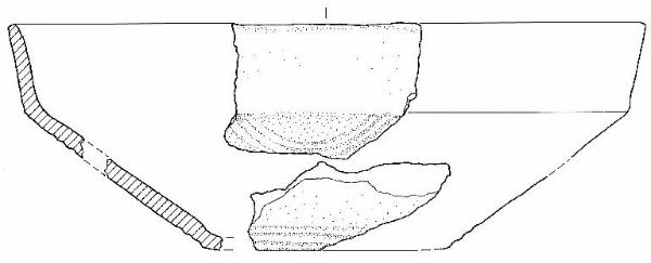 Scodellone con orlo piatto, corpo carenato a parete rettilinea, con Ø orlo > Ø carena, vasca troncoconica. La vasca è decorata da un fascio di tre solcature con andamento ad "U", poste immediatamente al di sotto della linea di carena, e da un fascio di tre solcature poste alla base della vasca, concentriche al fondo.\nImpasto a tessitura fine, di colore grigio (7,5R6/0), inclusi puntiformi e granulosi, con frequenza abbondante e distribuzione irregolare. Superficie lisciata e a tratti lucidata, esterna di colore grigio scuro (2,5Y4/0), interna di colore bruno (7,5YR5/2) e grigio (7,5R5/0).