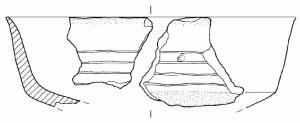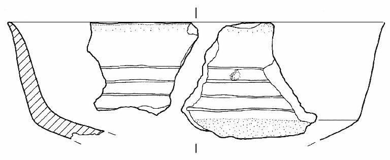 Capeduncola con orlo assottigliato, corpo carenato a parete rettilinea, con Ø orlo > Ø carena, vasca troncoconica. Sopra la linea di carena vi sono quattro sottili solcature orizzontali e parallele, alla distanza di circa 4-5 mm l'una dall'altra.\nImpasto a tessitura fine, di colore grigio (7,5R5/0), inclusi puntiformi, con frequenza abbondante e distribuzione regolare. Superficie lisciata e a tratti lucidata, esterna di colore bruno (7,5YR5/2), interna di colore grigio (7,5R5/0).