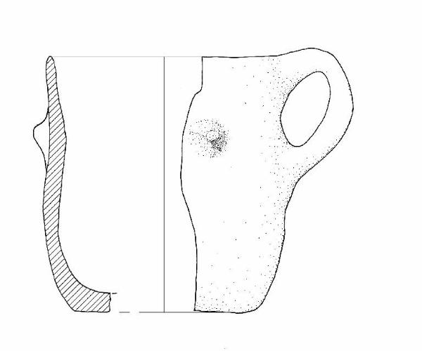 Orlo di forma arrotondata; fondo piano. Ansa nastriforme ad orecchio impostata all'orlo. Bugnetta conica poco sotto l'orlo.\nColore: grigio.