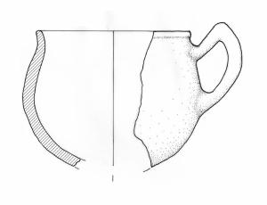 Orlo di forma arrotondata. Ansa nastriforme a gomito.\nColore: marrone scuro.