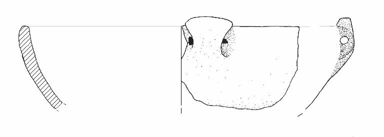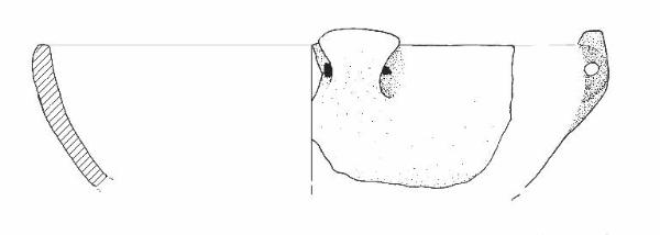 Orlo di forma arrotondata; ansa a tunnel con appendice asciforme sopraelevata impostata all'orlo.\nColore: marrone grigio.