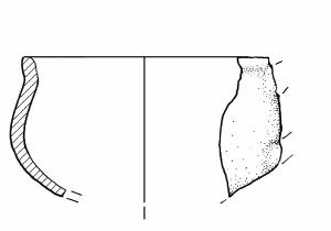 Orlo di forma arrotondata; profilo sinuoso. Ansa impostata poco sotto l'orlo.\nColore: grigio molto scuro.