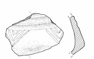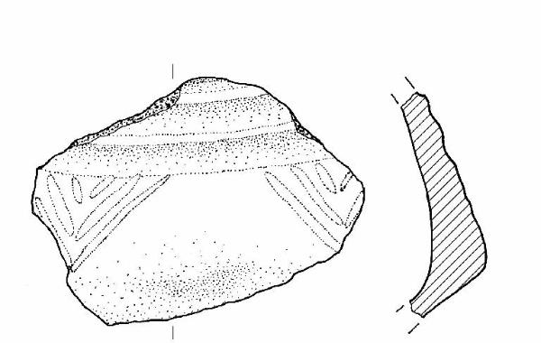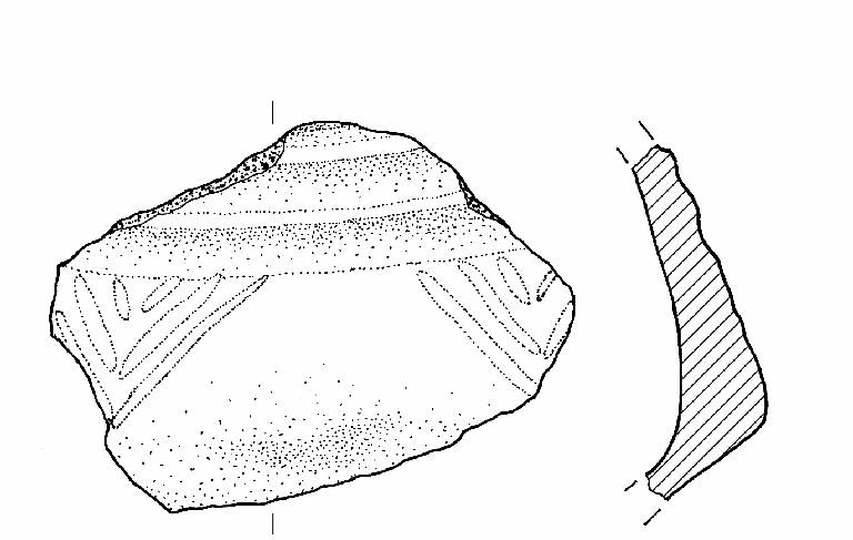 Porzione relativa al diametro max con piccola bozza. Al di sopra motivo a triangoli capovolti e linee parallele ottenute a solcature.\nColore: grigio chiaro.