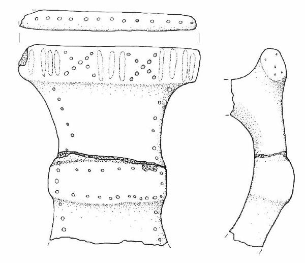Ansa nastriforme, presenta un rigonfiamento a circa metà della lunghezza.\nDecorazione ottenuta con puntini impressi.\nColore: grigio scuro.