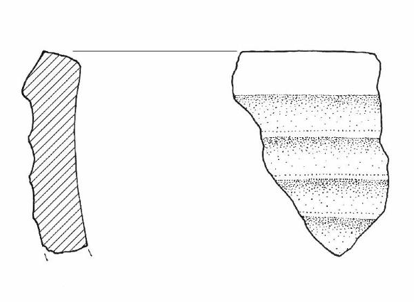 Orlo piatto obliquo verso l'interno. Sulla parete larghe solcature.\nColore: beige.