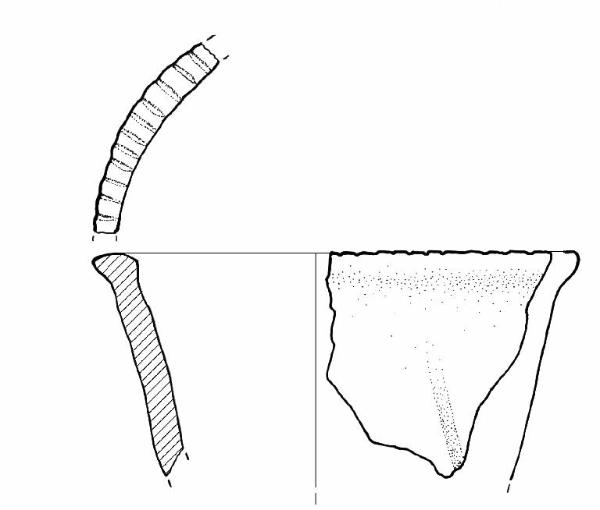 Orlo piatto, leggermente esoverso decorato a tacche. Parete rettilinea con leggera solcatura obliqua.\nColore: grigio.
