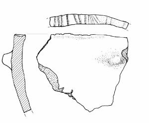 Orlo piatto decorato a tacche. Sulla parete, poco sotto l'orlo, presa a linguetta.\nColore: marrone grigio.