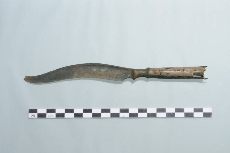 Lama decorata con un motivo ad anatrelle. Manico composito ricoperto in avorio e francato con piccoli ribattini in bronzo.