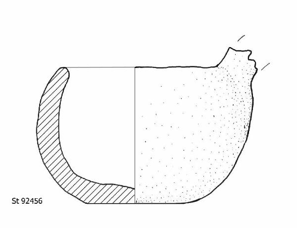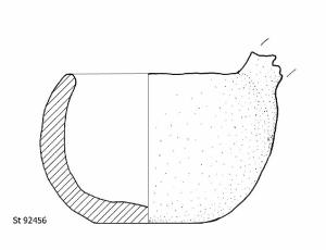 Orlo di forma arrotondata, rientrante; corpo sferoidale, fondo piano. Presa impostata in corrispondenza dell'orlo.\nColore: beige.