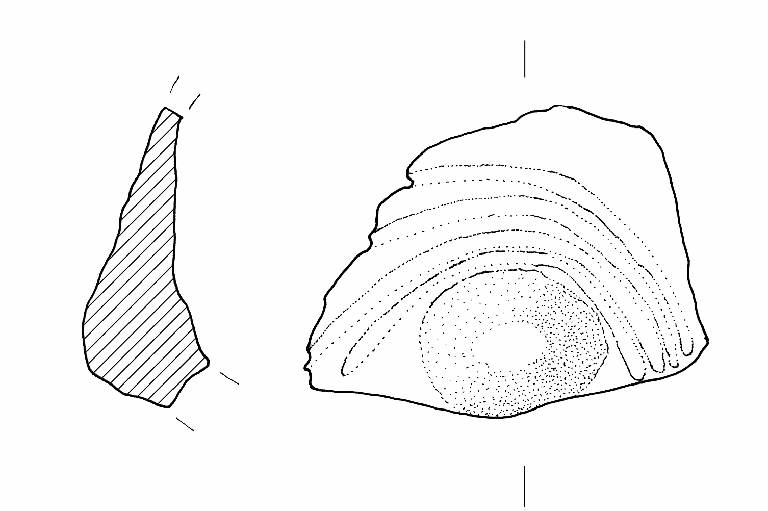 Bugna sferoidale contornata da solcature concentriche.\nColore: grigio.