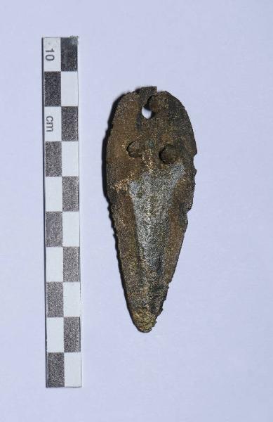 Base semicircolare con tre ribattini; corta lama costolata.